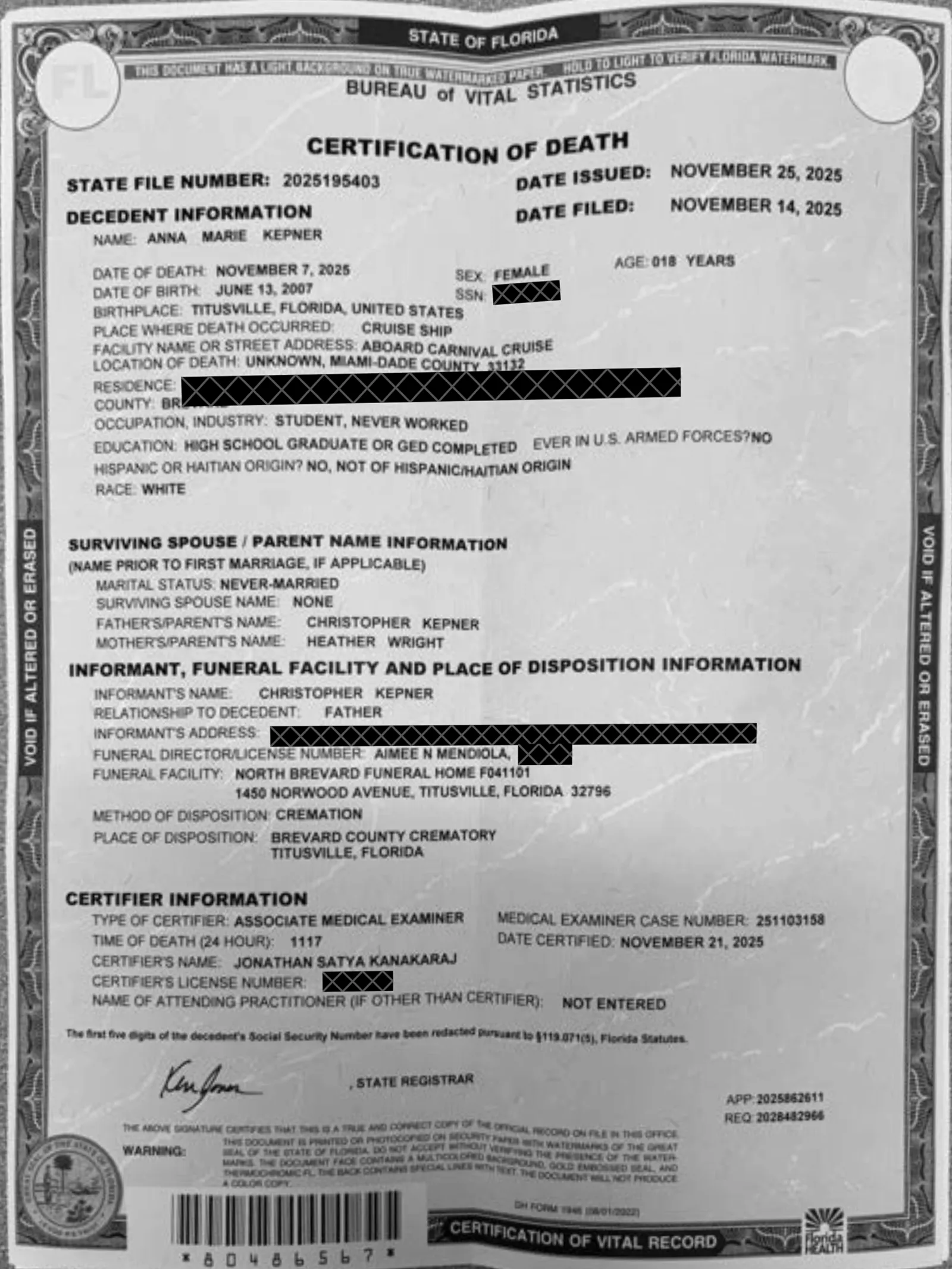 The public version of her death certificate—issued November 25 by the Florida Bureau of Vital Statistics—confirms that she died on November 7 aboard a cruise ship and that her remains were to be cremated at the Brevard County Crematory in Titusville, Florida.